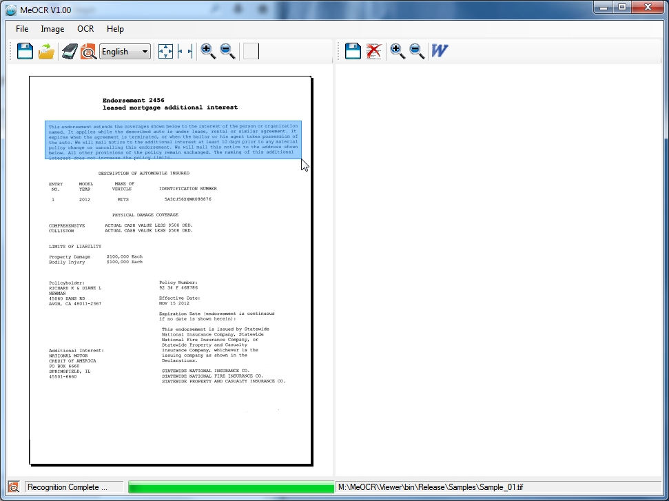 Files\MeOCR\Samples\Sample_01.tif”: Click on Open to load the image. The image